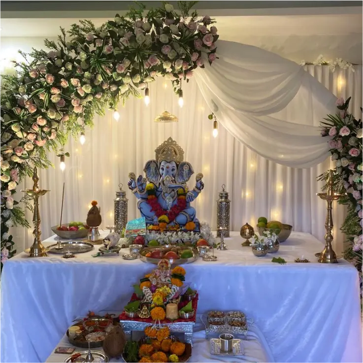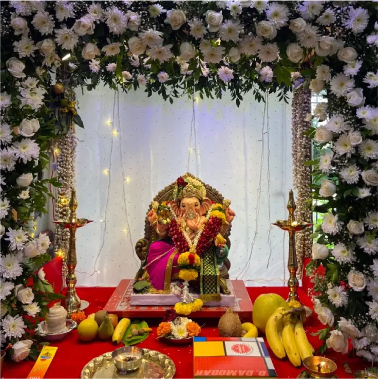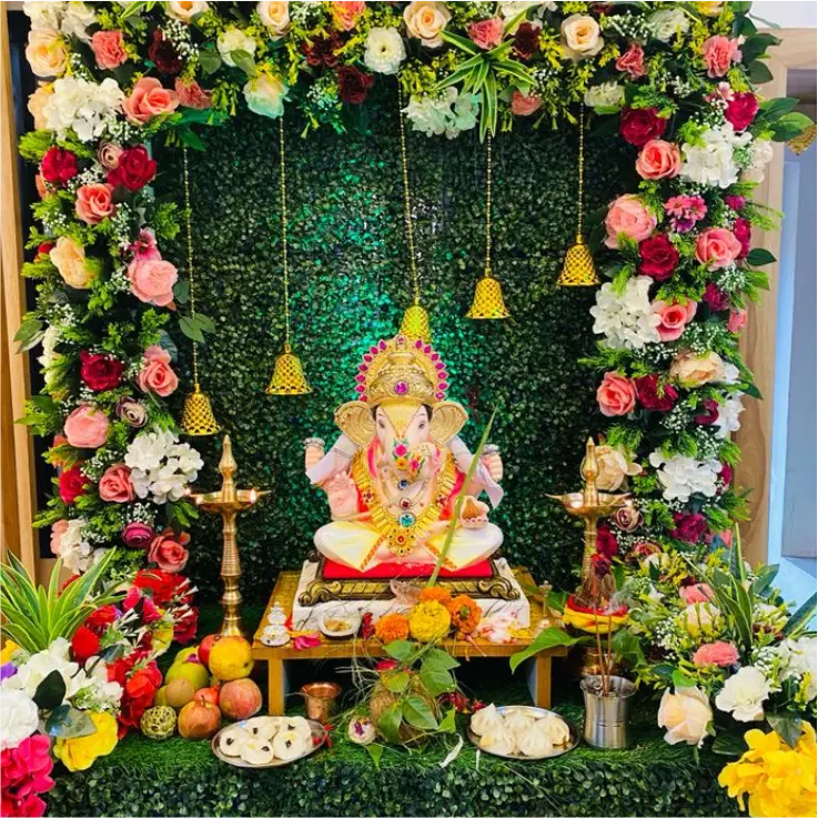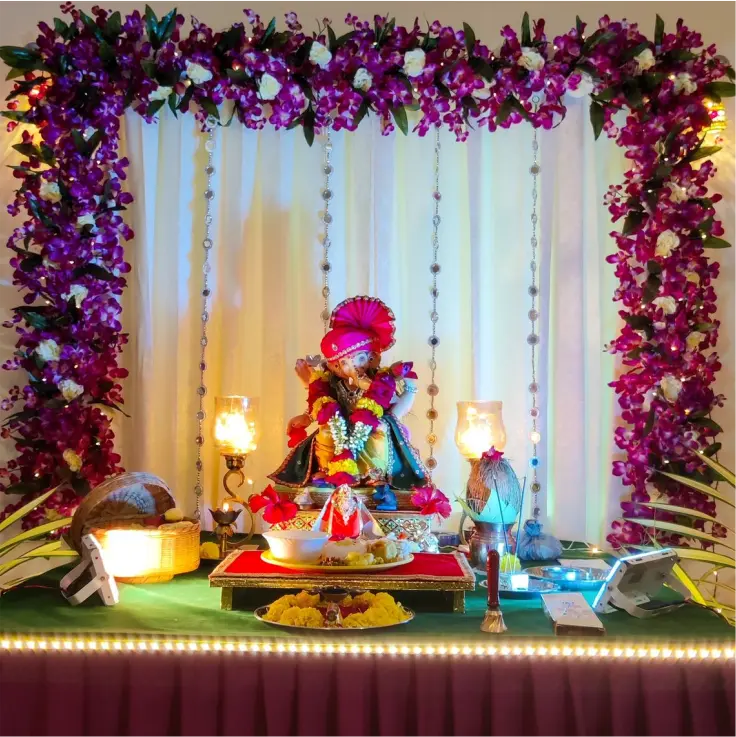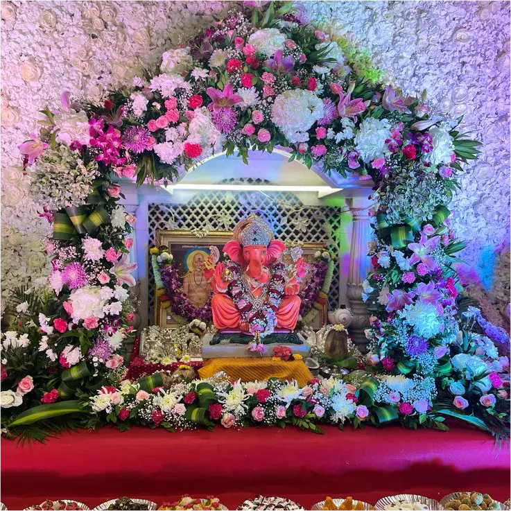 Ganpati and Gauri décor with flowers creates a vibrant and divine ambiance, blending tradition with beauty. Fresh blooms are used to adorn idols, pandals, and surroundings, symbolizing purity, devotion, and celebration during the festive rituals.