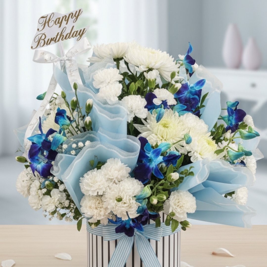 Whether you’re looking for a flower bouquet for birthday gift, a graceful flower bouquet as wedding anniversary gift, or a fresh flower bouquet for home decor, this arrangement is a perfect choice. The combination of blue and white tones adds sophistication to any setting, making it ideal for both gifting and decoration.