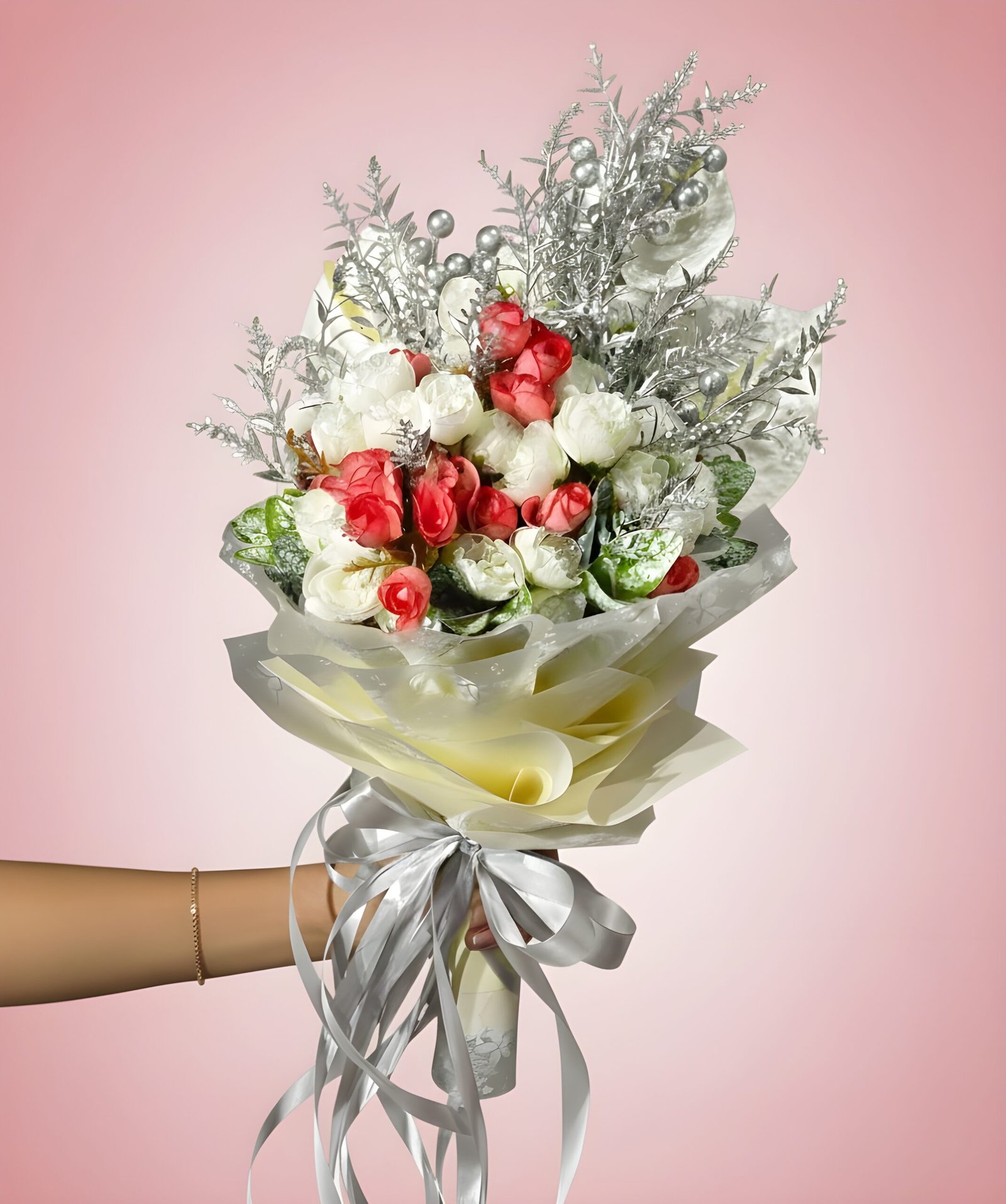 Step into a world of grandeur with The Regal Aura Artificial Flower Bouquet, a statement creation by Aurafloral Studio that embodies elegance, celebration, and timeless charm. Designed to make an impression, this bouquet blends rich tones with shimmering accents for a truly royal presence. The Regal Aura features a refined mix of ivory and blush-red roses, delicately arranged amidst silver-dusted foliage, pearl-like berries, and textured green leaves. Wrapped in soft ivory layers and finished with flowing silver satin ribbons, the bouquet offers a striking balance between warmth and luxury—perfect for festive occasions, grand gifting, or sophisticated interior styling. Crafted to retain its beauty forever, The Regal Aura brings the splendor of fresh florals without the need for care or upkeep.